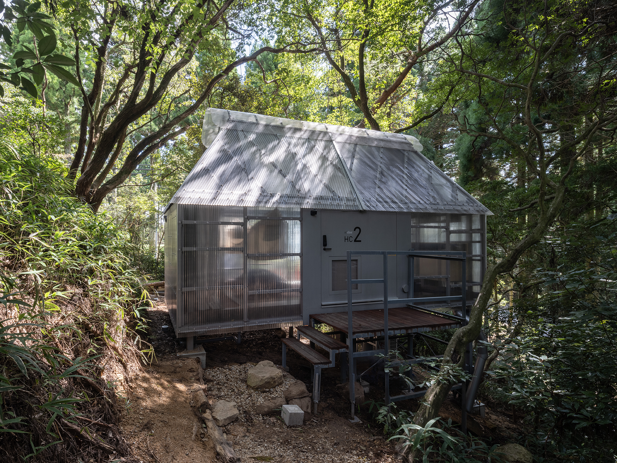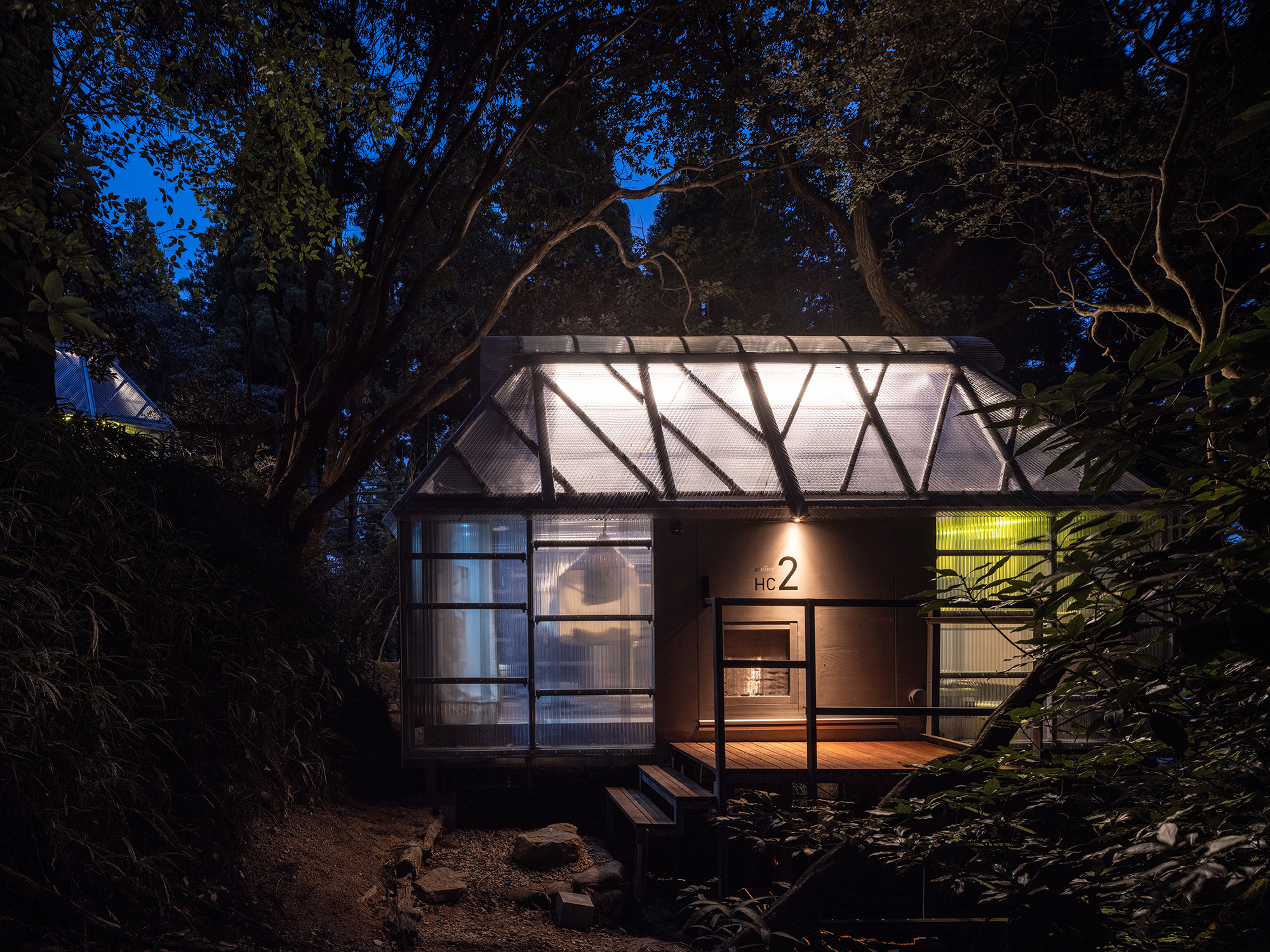 HC is a single-story designed cottage, where the kitchen, dining area, living space, and sanitary facilities blend seamlessly together. The small, horizontally oriented cottage with its triangular roof is designed to harmonize with the surrounding forest, providing a space in tune with nature. As the wind breezes through and you become entranced by the flames of the bonfire, you can spend leisurely moments. We deliver a blissful time where you can heal your mind and body, and find relaxation from within.